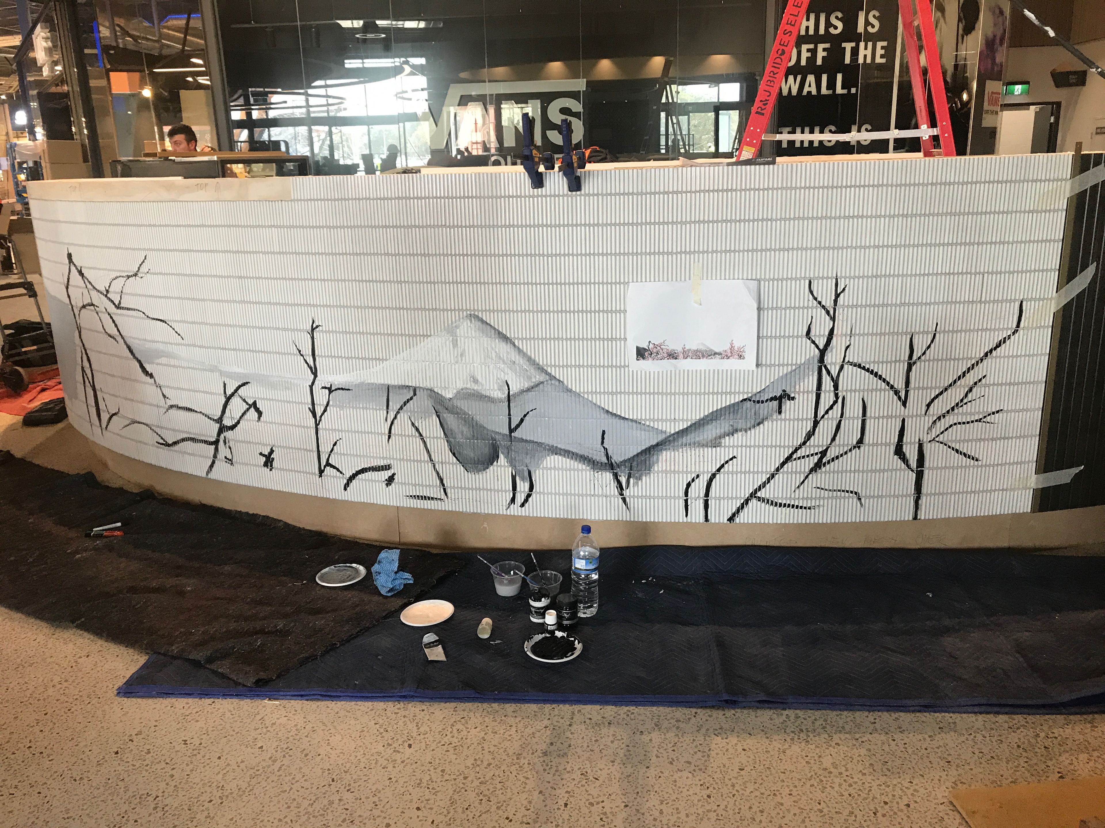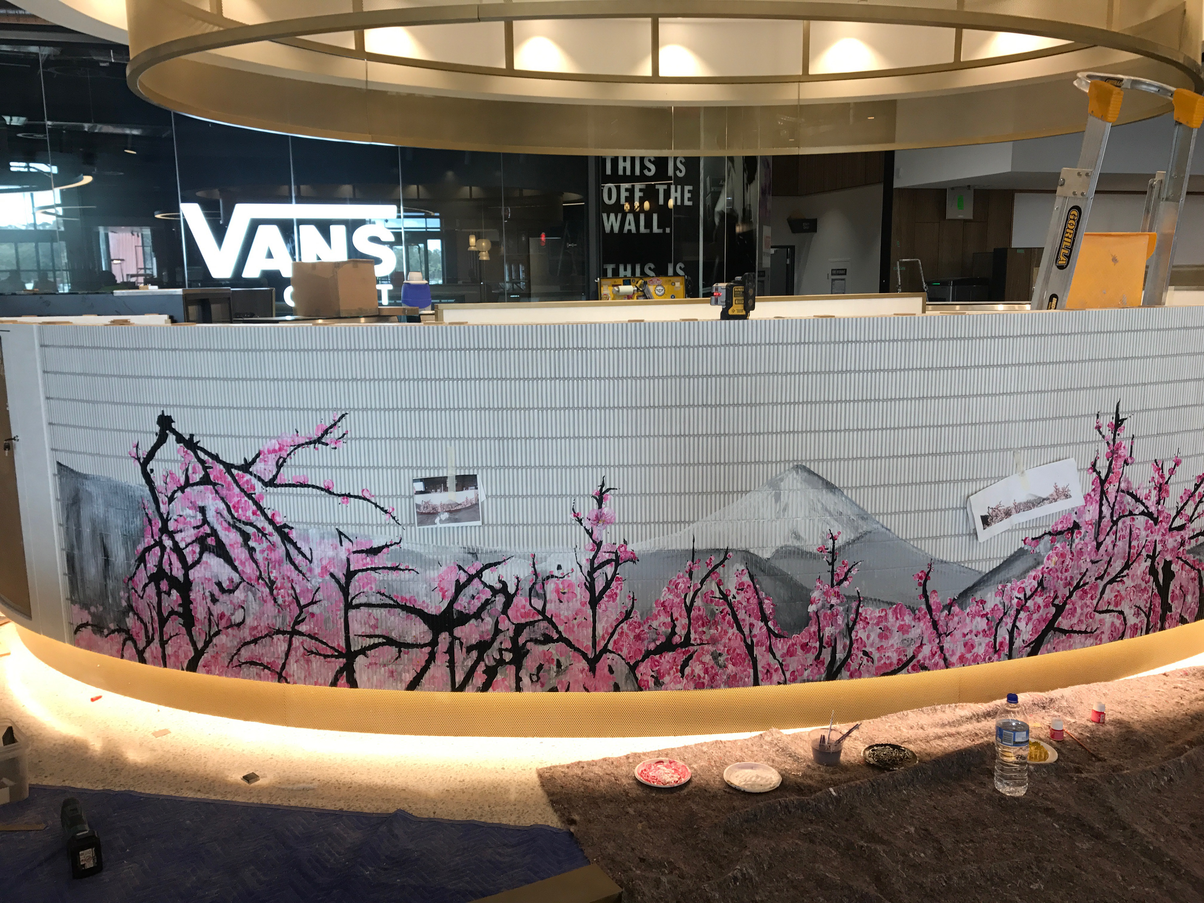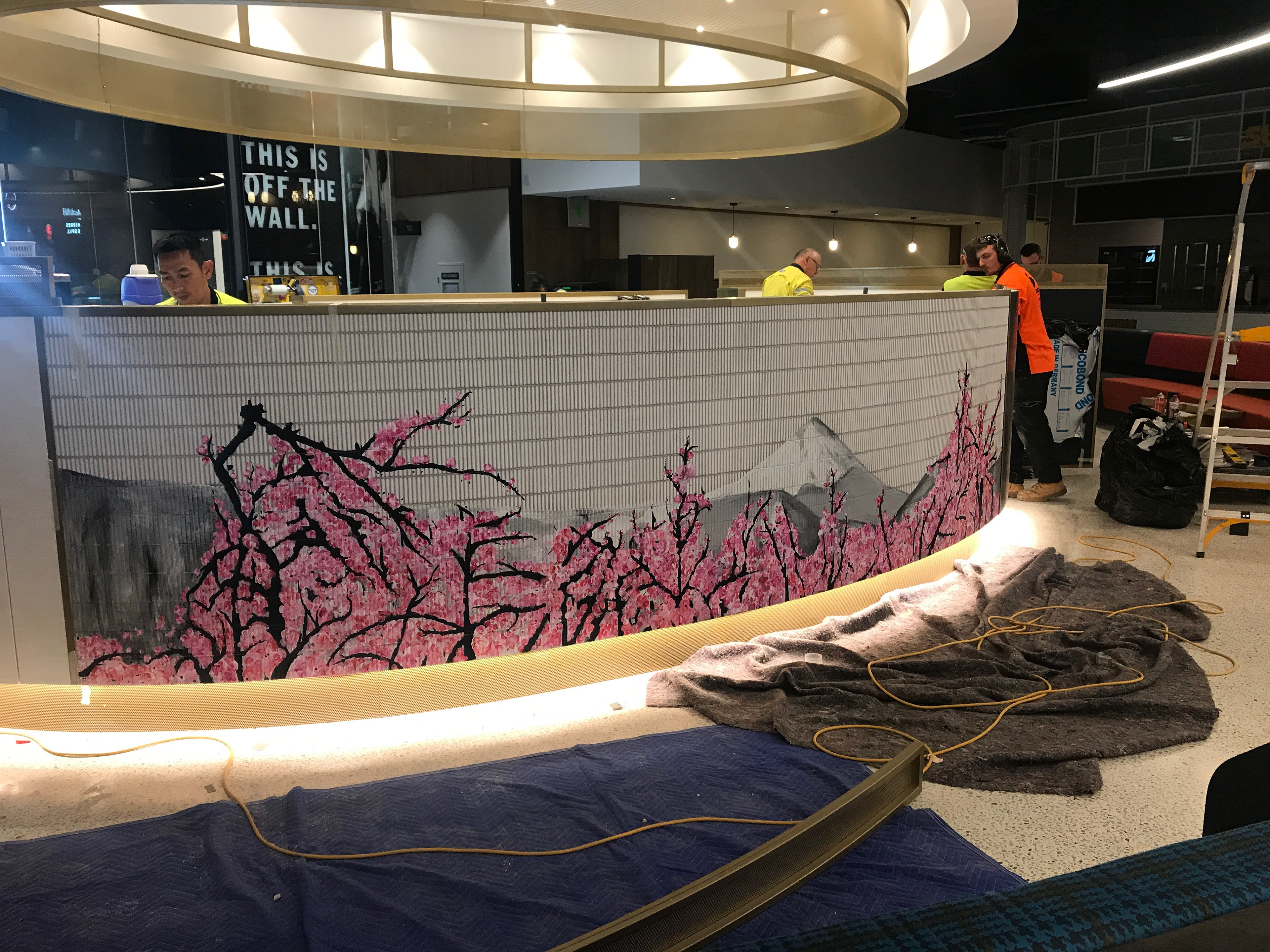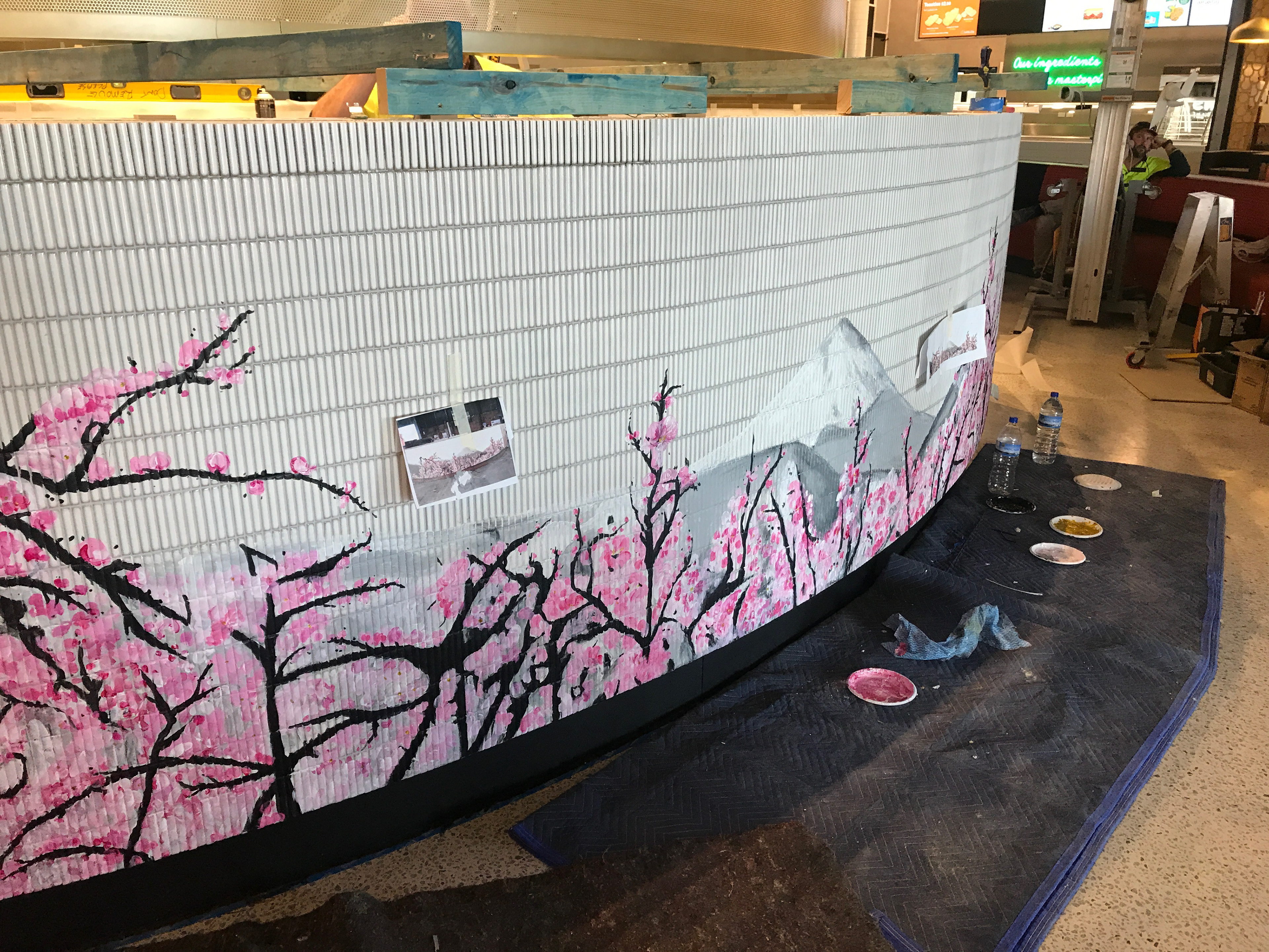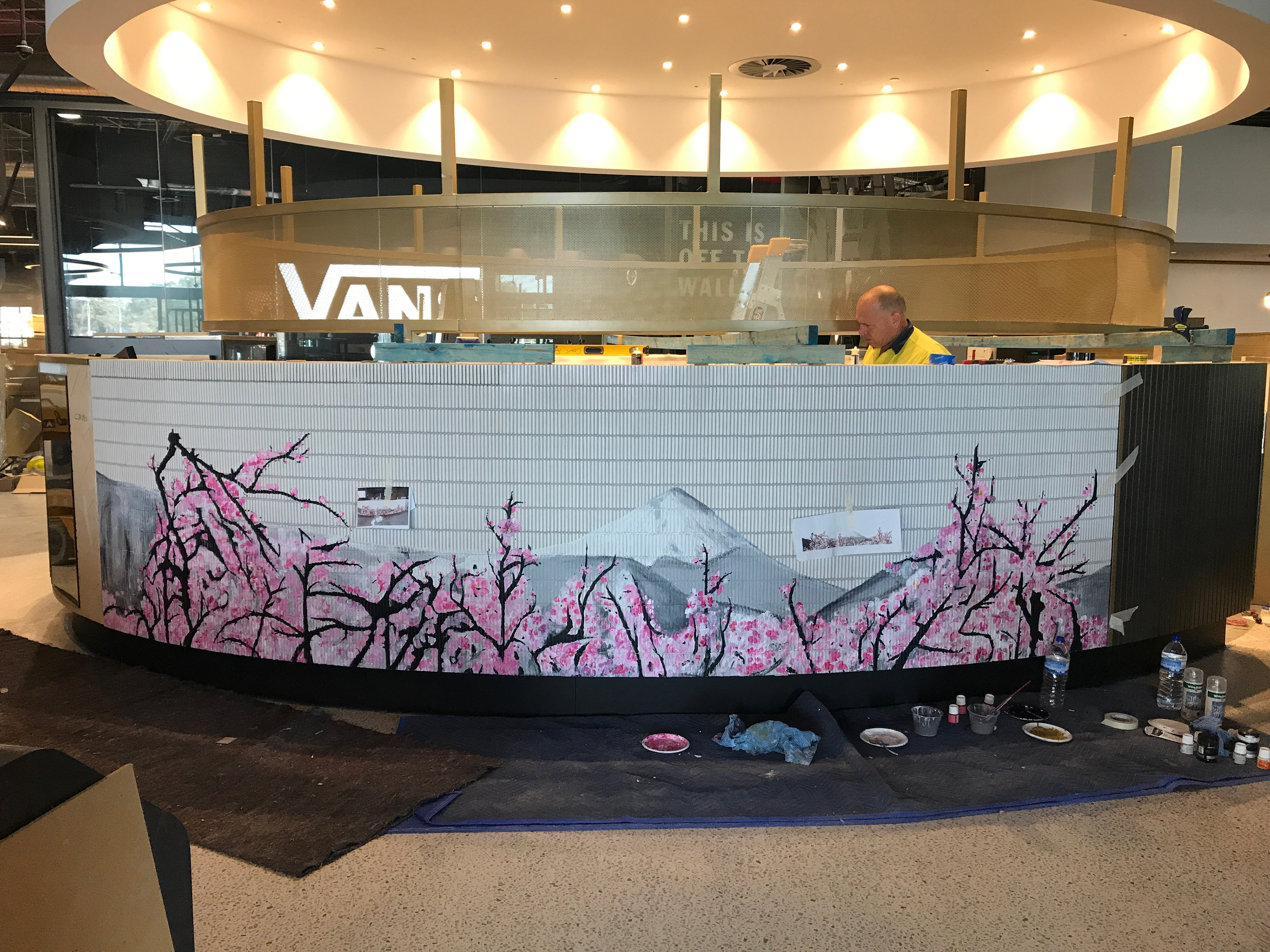 A custom artwork created for Sushi Sushi at the DFO development in Perth, WA. The artwork was inspired by Japanese cherry blossoms and Mt Fuji and was painted directly onto the tiles surface of their kiosk in the centre of the food court.