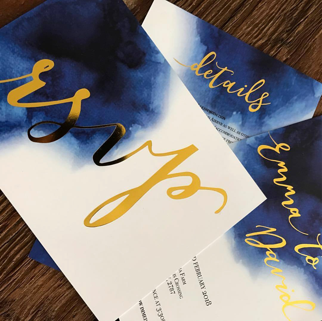 Custom wedding invites for Emma and David's wedding using watercolour and foiling.